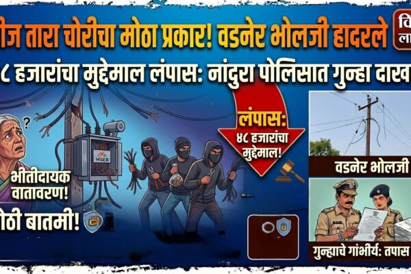 नांदुरा :- तालुक्यातील वडनेर भोलजी शिवारात वीज तारा चोरीचा प्रकार उघडकीस आला असून अज्ञात चोरट्यांनी सुमारे ४८ हजार रुपयांचा मुद्देमाल लंपास केला आहे. ही घटना ७ ते ८ एप्रिलदरम्यान घडल्याचे समोर आले आहे. मिळालेल्या माहितीनुसार, भोजने रोहित्र परिसरातील सहा गाळ्यांमधून तीन फेज, चार वायर प्रणालीतील सुमारे १२०० मीटर लांबीची वीज तार चोरीला गेली आहे. या…