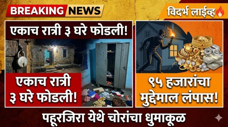 वर्दडी बुद्रुक :- किनगाव राजा पोलिस ठाण्याच्या हद्दीतील वर्दडी बुद्रूक येथे पहाटेच्या सुमारास चोरट्यांनी धाडसी चोरी करत बसस्थानक परिसरातील पाच दुकाने फोडून सुमारे ६४ हजार रुपयांची रोकड लंपास केल्याची घटना गुरुवारी उघडकीस आली. या प्रकारामुळे स्थानिक व्यापाऱ्यांमध्ये भीतीचे वातावरण निर्माण झाले आहे. मिळालेल्या माहितीनुसार, अज्ञात चोरट्यांनी पहाटे सुमारे २.४५ वाजताच्या सुमारास दुकाने लक्ष्य करत शटर…
