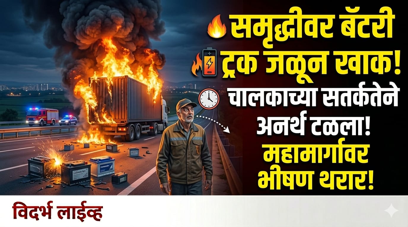 मेहकर :- तालुक्यातील दुसरबीडजवळ मुंबई-नागपूर समृद्धी महामार्गावर इन्व्हर्टरच्या बॅटऱ्या वाहून नेणाऱ्या ट्रकला अचानक आग लागून तो काही क्षणांतच जळून खाक झाल्याची घटना रविवारी सकाळी घडली. चालकाच्या प्रसंगावधानामुळे मोठी दुर्घटना टळल्याचे सांगितले जात आहे. मिळालेल्या माहितीनुसार, गाझीपूर येथील चालक रोहित कुमार हा यूपी ६५ आरडी २१४० क्रमांकाच्या ट्रकमधून बनारस येथून नाशिकच्या दिशेने इन्व्हर्टरच्या बॅटऱ्या घेऊन निघाला होता. सकाळी सुमारे ८ वाजताच्या सुमारास दुसरबीड परिसरातील चॅनेल क्रमांक ३१२ जवळ ट्रकमधून धूर निघू लागल्याचे त्याच्या लक्षात आले.
