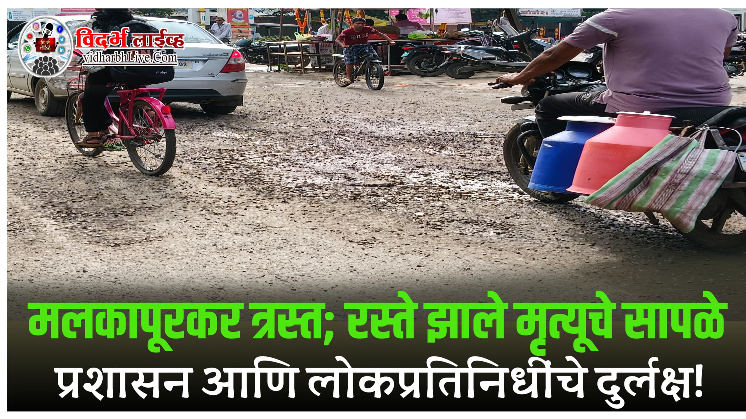 मलकापूर :- ( उमेश इटणारे ) शहरातील रस्त्यांची अवस्था पाहून नागरिकांचा रोष उफाळून आला आहे. गणपती नेत्रालय ते दीपक नगरपर्यंतचा बुलढाणा रोड अक्षरशः खड्ड्यांनी भरून गेला आहे. या खड्ड्यांमुळे वाहनधारकांना जीव मुठीत धरून प्रवास करावा लागत असून आतापर्यंत अनेक जण जखमीही झाले आहेत. याचप्रमाणे चांडक विद्यालयाकडे जाणाऱ्या रस्त्याचीही परिस्थिती गंभीर आहे. दररोज हजारो विद्यार्थी या रस्त्याने प्रवास करतात. मात्र रस्त्यावरील खड्ड्यांमुळे कधीही मोठा अपघात होण्याची भीती व्यक्त होत आहे. शहरातील इतर अनेक रस्त्यांचीही हीच दयनीय अवस्था असून प्रशासन आणि लोकप्रतिनिधींचे पूर्णपणे दुर्लक्ष असल्याने नागरिक संतापले आहेत. मुलभूत सुविधा देण्यात अपयशी ठरत असलेल्या प्रशासनावर प्रश्नचिन्ह निर्माण झाले आहे.