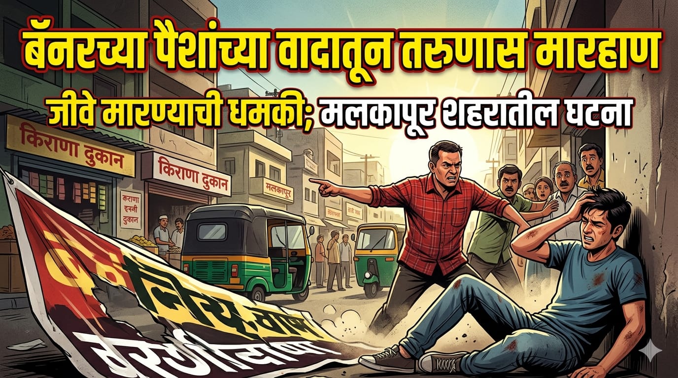 मलकापूर : शहरातील वॉटर सप्लाय परिसरात बॅनरच्या पैशांच्या वादातून एका तरुणास मारहाण करून जीवे मारण्याची धमकी दिल्याची घटना २५ एप्रिल रोजी उघडकीस आली आहे. या प्रकरणी मलकापूर शहर पोलीस ठाण्यात एन.सी. नोंद करण्यात आली आहे. अमोल रामलाल बच्छीरे (वय २३, रा. रोहीदास नगर, मलकापूर) हे २५ एप्रिल रोजी वाटर सप्लाय परिसरात जात असताना दोन दिवसांपूर्वी बॅनरच्या पैशांवरून झालेल्या वादातून सागर खराटे (रा. मलकापूर) याने त्यांना अडवून मारहाण केली. यावेळी अमोल यांनी समजावण्याचा प्रयत्न केला असता आरोपीने त्यांना शिवीगाळ करत “एका दिवशी मारून टाकीन” अशी धमकी दिल्याचे फिर्यादीत नमूद आहे. या प्रकरणी पोलिसांनी भारतीय न्याय संहिता (BNS) कलम 115(2), 351(2), 352 अन्वये एन.सी. क्रमांक 333/2026 नोंदविले आहे. पुढील तपास पोलीस करत आहेत.
