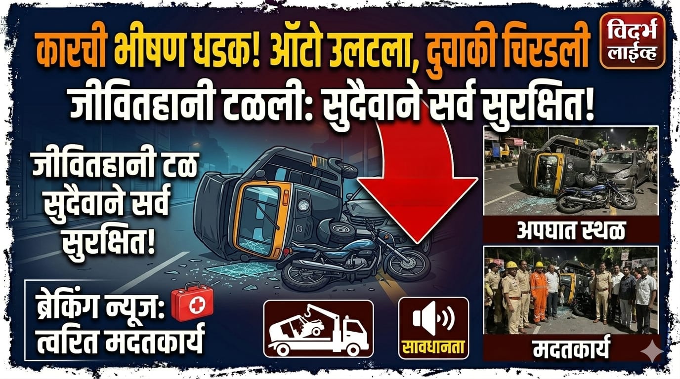 कारच्या धडकेत ऑटो उलटून; दुचाकी चिरडली, सुदैवाने जीवितहानी टळली
