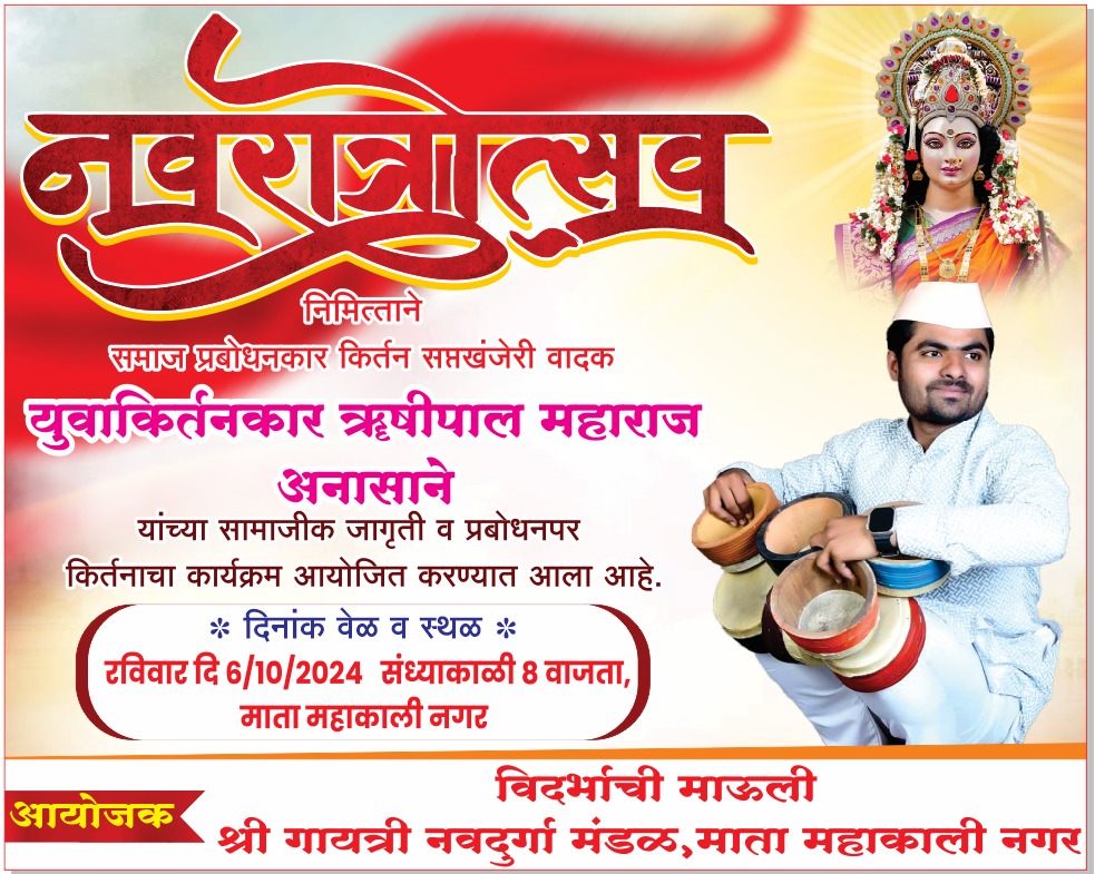येथील माता महाकाली नगरातील गायत्री नवदुर्गा उत्सव मंडळाच्या वतीने सप्त खंजिरी वादक सत्यपाल महाराजांचे शिष्य, युवा कीर्तनकार ऋषीपाल महाराज यांचे समाज प्रबोधन कर कीर्तन आज दि ०६ ऑक्टोबर रविवार रोजी सायंकाळी ८ वाजता माता महाकाली नगर येथे संपन्न होणार आहे. नवरात्र उत्सवानिमित्त गायत्री मंडळाच्या वतीने विविध समाज प्रबोधन पर कार्यक्रम व शैक्षणिक व सामाजिक उपक्रमा अंतर्गत अनेक कार्यक्रमांचे आयोजन होत आहे. यामध्ये विद्यार्थ्यांकरिता सामान्यज्ञान स्पर्धा, चित्रकला स्पर्धा, रांगोळी स्पर्धा, ज्येष्ठ महिलांकरता श्लोक व मंत्रोच्चार व गायत्री मंत्र पठन स्पर्धा आरोग्य तपासणी शिबिर असे विविध कार्यक्रमाचे आयोजन होत आहे. या निमित्ताने आज होणाऱ्या समाज प्रबोधन पर किर्तन कार्यक्रमासाठी नागरिक माता भगिनींनी मोठ्या उपस्थित राहण्याचे आवाहन मंडळाच्या वतीने करण्यात आले आहे.